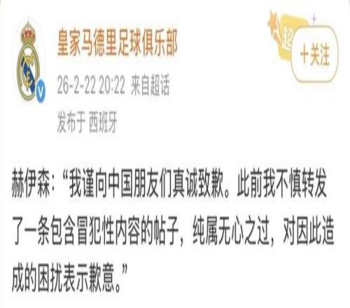 随着舆论发酵,赫伊森迅速删除了相关动态,但其个人主页并未立即作出任何解释 。直至22日晚,皇马的官方微博发布了一则简短声明,以赫伊森的口吻写道:“我谨向中国朋友们真诚致歉。此前我不慎转发了一条包含冒犯性内容的帖子,纯属无心之过,对因此造成的困扰表示歉意。”然而,这份道歉非但未能平息众怒,反而引发了更大规模的质疑。细心的网友发现,这则道歉仅出现在拥有百万粉丝的皇马中文官方微博上,而在皇马俱乐部官网、海外社交平台账号,乃至当事人赫伊森自己的海外社交账号,均找不到任何道歉的踪影 。