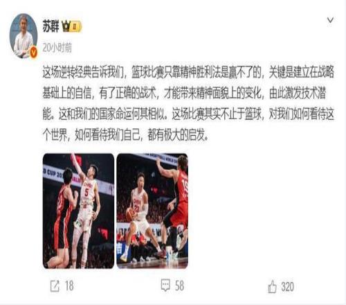 这场比赛的三名裁判分别来自新西兰、泰国和新加坡,其中两名我们还非常的熟悉,他们从下半场开始发力,最后2分钟时间里的判罚更加的离谱,但那又怎样?中国队有着绝对的实力和必胜的决心,即便是客场5打8依旧可以拿下比赛。苏群老师点评这场比赛时候说到“篮球比赛只靠精神胜利法是赢不了的,关键是建立在战略基础上的自信,有了正确的战术,才能带来精神面貌上的变化,由此激发技术潜能。”