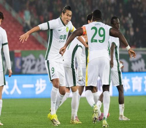 3月8日,北京国安队球员张玉宁(左一)进球后与队友庆祝。新华社记者 肖艺九 摄