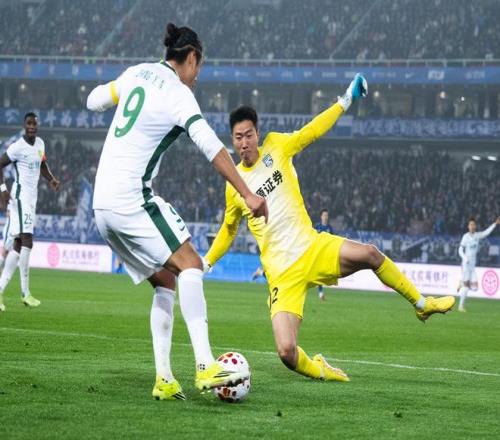 3月8日,武汉三镇队球员明天(左)与北京国安队球员邓捷夫在比赛中拼抢。新华社记者 肖艺九 摄