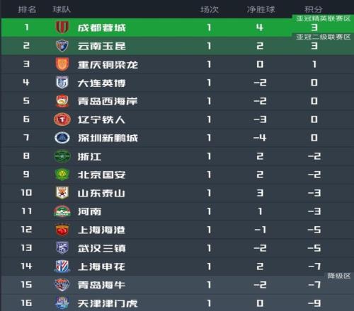 北京时间3月8日,2026赛季中超首轮战罢。成都蓉城和云南玉昆同积3分,蓉城凭借2个净胜球优势,暂时领跑积分榜。