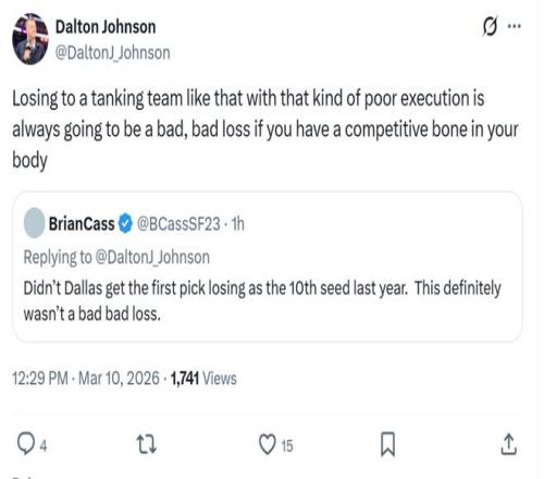 勇士记者Dalton Johnson给出了相同的看法:“输给这样一支糟糕的摆烂球队,对于任何有竞争心的人来说,都是一场极其糟糕的失利。”