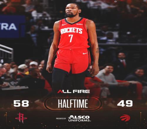 谢泼德三分命中,火箭队连拿4分开始第二节,巴雷特手感不错连进四球,猛龙队以40-39反超。申京打3分回应,巴雷特三分命中,杜兰特和汤普森合取5分,半场前4分50秒时火箭队以49-45领先。猛龙队追回4分,杜兰特保持手感又拿5分,卡佩拉和汤普森均两罚全中,半场结束时火箭队以58-49领先9分。