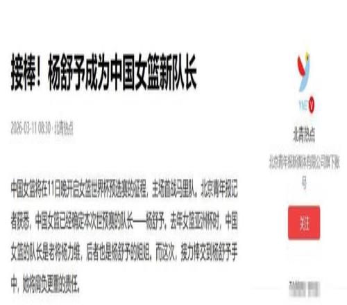 《接棒!杨舒予成为中国女篮新队长》北青热点