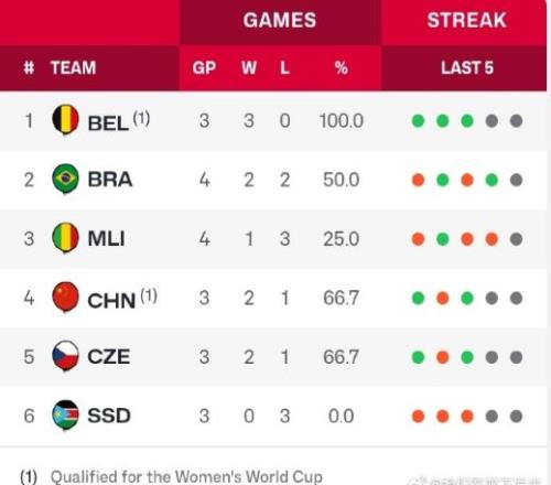 中国女篮在此前FIBA官方公布的世预赛实力榜中高居第五,在B组的6支球队当中仅次于比利时女篮。根据中国女篮前四场的世预赛比赛情况来看,中国女篮仅输给了实力榜排名第四的比利时女篮,毕竟对手是最近两届欧洲杯女篮冠军,拥有梅斯曼等多位WNBA球星,整体实力在中国女篮之上。