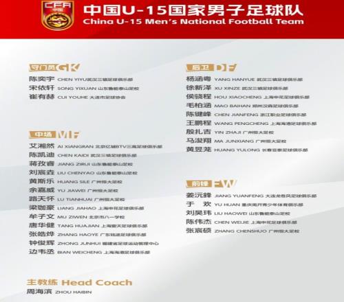 本届U15男足的主教练是前国脚周海滨,30名运动员里,恒大足校有6人入围,也是入选最多的。