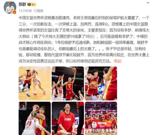 与此同时,苏群还提到了李梦,强调:“资格赛上的中国女篮跟得世界杯亚军的女篮比有了非常大的变化,主要表现在:因为没有李梦,前锋线大大弱化,后可能很难有李梦了”。