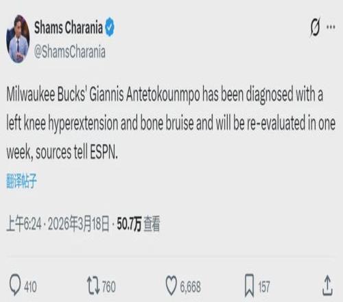 北京时间3月18日,据NBA名记Shams报道,雄鹿球星扬尼斯-阿德托昆博被诊断为左膝过度伸展和骨挫伤,将在1周后接受复查。常规赛仅剩3周多,如今雄鹿28胜39负仅排东部第11,落后第10黄蜂5.5个胜场,附加赛没什么希望了。