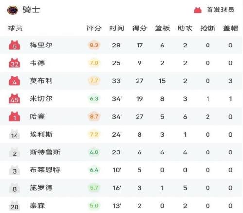 第三个关键短板则是角色球员整体发挥极不稳定,替补深度严重不足。除哈登、莫布里与梅里尔三人外,其余球员得分贡献极为有限:首发后卫韦德仅得9分,斯特鲁斯与施罗德双双未能突破两位数,替补席更未提供任何实质性火力支援。