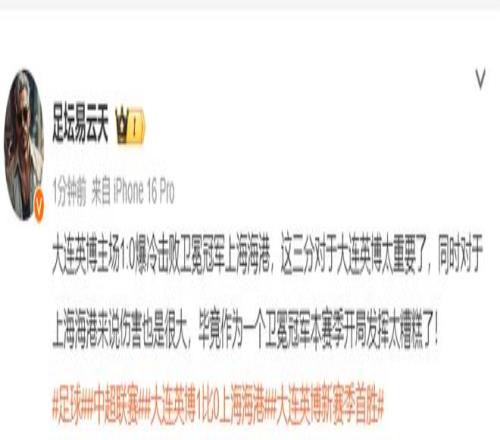 知名博主“足坛易云天”发文表示,大连英博主场1:0爆冷击败卫冕冠军上海海港,这三分对于大连英博太重要了,同时对于上海海港来说伤害也是很大,毕竟作为一个卫冕冠军本赛季开局发挥太糟糕了!