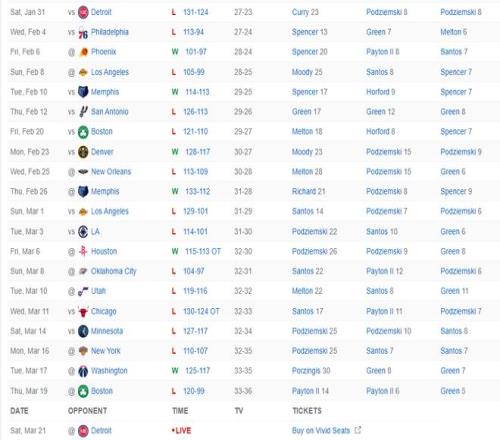 自1月31日以来勇士队的21场比赛他们只赢了6场比赛,库里缺席的20场比赛输掉了14场比赛,虽然库里的训练师兼篮球表现教练布兰登-佩恩声称库里本赛季肯定会回归,可目前库里依旧没有确定的复出时间表。