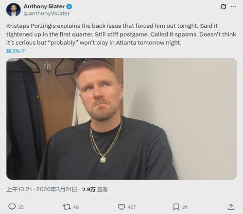 比输球更让勇士扎心的是,又有一名主力球员因伤退赛。第二节还剩5分钟左右,勇士中锋波尔津吉斯背部受伤,直接退出比赛。赛后接受采访时,波神说道:“现在我的腰背依然很僵硬,我预计不会出战明天和老鹰的比赛。”