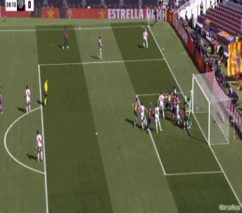 连续浪费机会的巴萨,在第24分钟利用角球的机会,由阿劳霍破门得分,在主场取得了1-0的领先,6分钟之后,拉菲尼亚再次获得机会,大禁区外的迎球怒射被客队门将扑了一下后,击中门框被弹出,半场比赛结束前,费尔明禁区内踢倒巴列卡诺进攻球员,但主裁判没有任何表示。