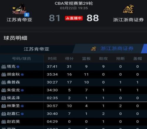 可江苏队毫无退意,刚刚在上一轮完成压哨绝杀广东宏远的他们,延续了滚烫的斗志与韧劲。从首节开始便寸土不让,广厦首节仅以微弱的4分占优;半场结束时领先优势也不过6分。进攻端全面滞涩,三分线外全场命中率低至26.3%,只能仰仗塔克单点爆破与胡金秋篮下强凿艰难维系局面。