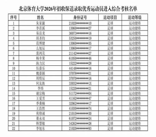 北京体育大学发布公告,经初步审核,现对进入综合考核的优秀运动员名单进行公布。