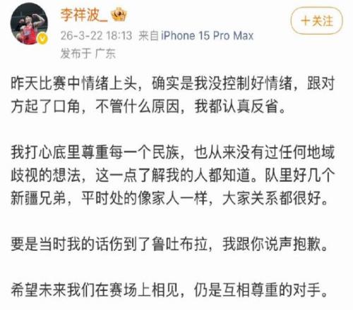 CBA官方宣布:李祥波停赛4场+罚款10万,鲁吐布拉停赛1场+罚款5万。