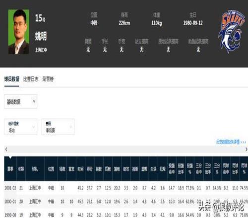 姚明在季后赛的数据远比常规赛夸张,打满10场比赛,场均交出37.7分20.2篮板3.5助攻3.7封盖,完全是CBA统治力最强的超级中锋。