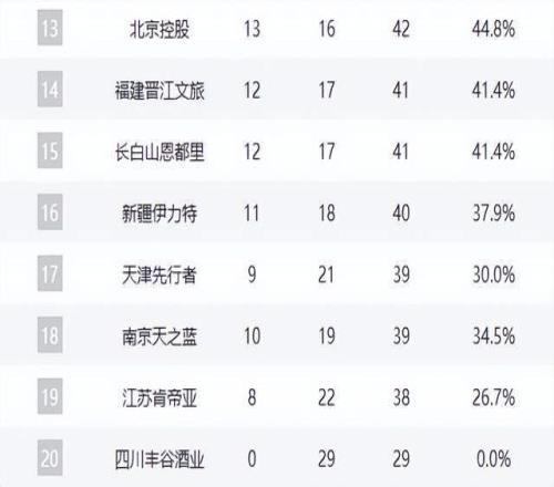 广州队与北控队同为13胜16负,暂居第11与第13,成为“季后赛守门员”。福建队(12胜17负)、吉林队(12胜17负)、新疆队(11胜18负)仍存理论晋级可能。天津队(10胜19负)、同曦队(10胜19负)陷入保级泥潭,江苏队(8胜22负)难求一胜,四川队则延续29连败,赛季已无悬念。