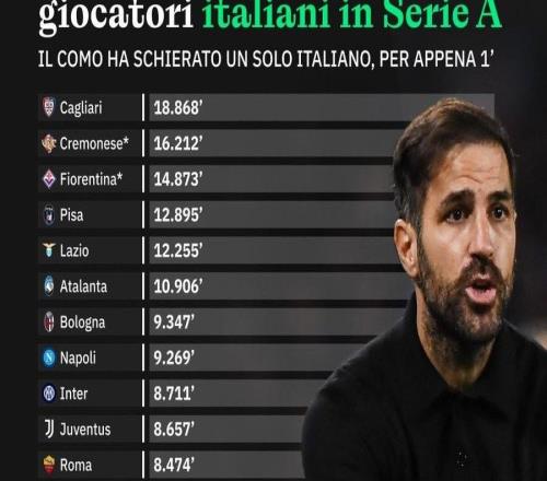本赛季意甲20队意大利球员出场时间排行榜:科莫1分钟垫底