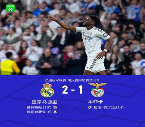 皇马总分31本菲卡晋级,维尼修斯破门,巴尔韦德助攻双响